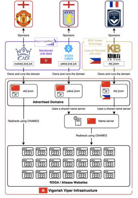 据研究人员称,数十个看似不相关的赌博品牌通过与欧洲体育队的赞助协议来宣传其网站,并使用相同的 Vigorish Viper 技术套件。虽然这些品牌看起来各不相同,但它们的运作方式更像是特许经营分支机构。