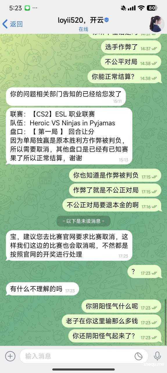 最好笑的是你们经理还给我说选手作弊了,为什么注单要作废,你们平台真是牛逼,会员投注违规就封号,选手作弊违规了就是正常的,按作弊比分来正常结算是吗