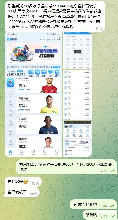 本人在乐鱼体育玩了400多天等级vip10,6月29号提款需要审核我的信息 我也提交了,7月1号账号就直接进不去,26号当天我就已经充值了200多万 我买的都是欧洲杯跟美洲杯 还有在乐鱼玩的大佬要小心 只应许你充值 不应许你提款。杀猪请认准亚博集团乐鱼体育!!做杀猪就上乐鱼体育。