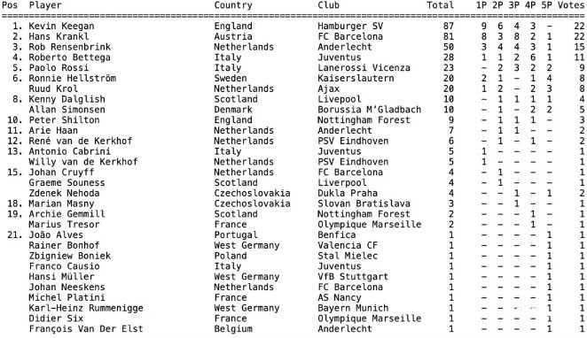 “经过激烈的竞争,凯文-基冈在1978年的金球奖排名中获得了第一名,87分领先于克兰克尔的81分。有9名评委在第一位选择了基冈,8人选择了克兰克尔,这几乎是持平的。